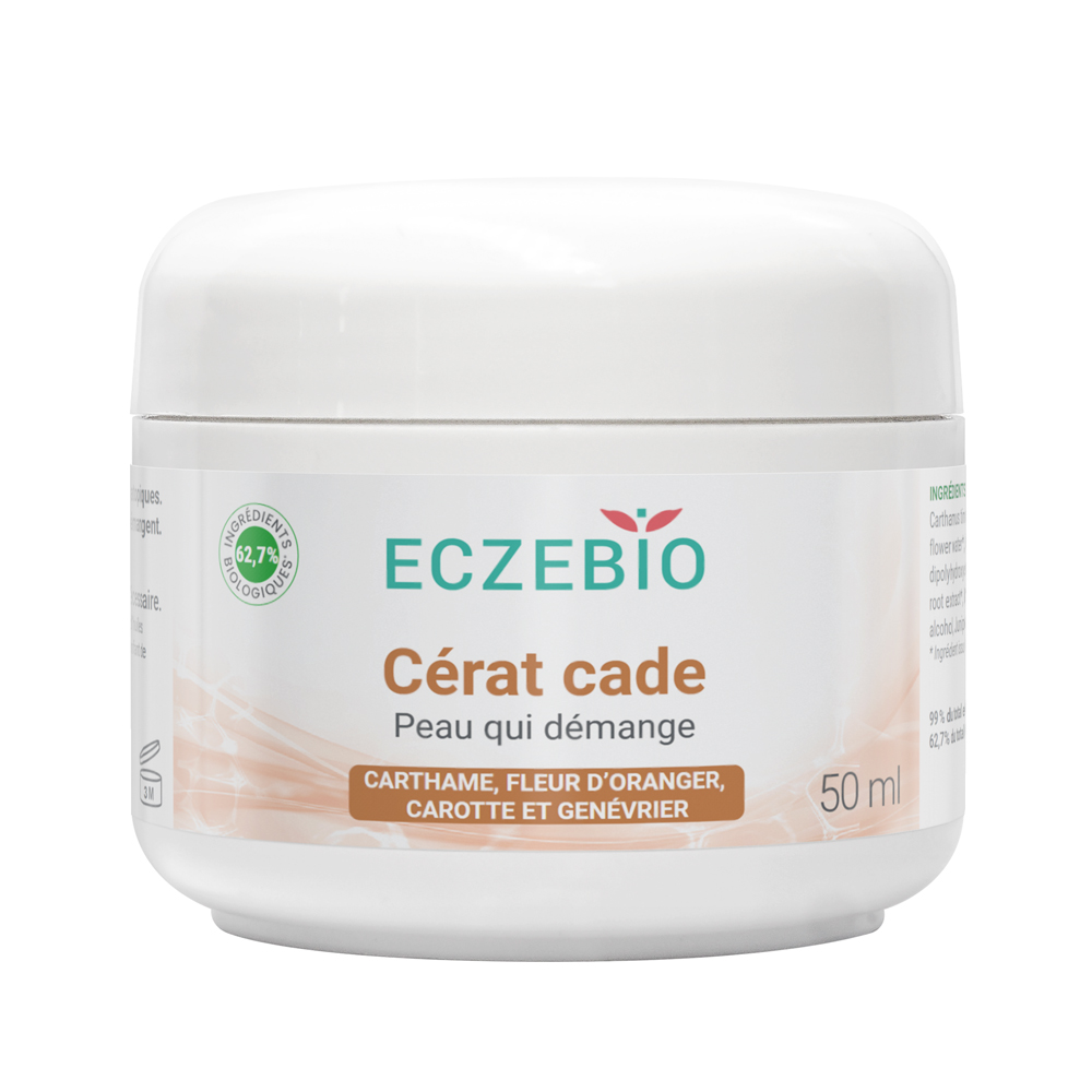 Le cérat Eczebio Cade est base de cire d’abeille et d’huiles de genévrier, de cade et de carotte biologiques, qui sont traditionnellement utilisées contre les démangeaisons.