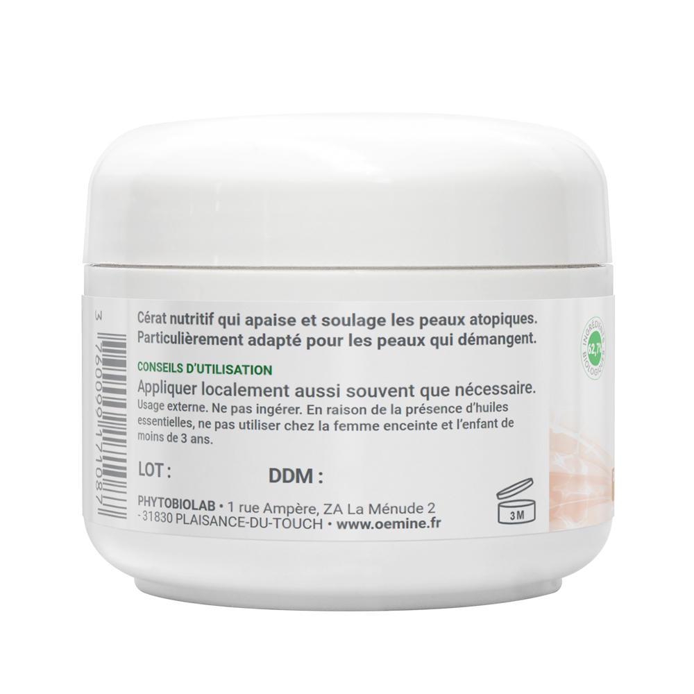 Le terme cérat vient du mot cire, car il associe de la cire d’abeille (ici biologique) avec des huiles riches. C’est l’un des plus anciens excipients dermatologiques. Sa formule remonte à la nuit des temps, depuis que l’on sait extraire la cire de la ruche !