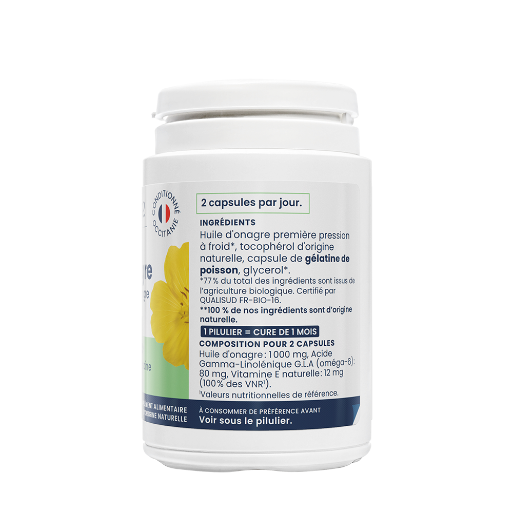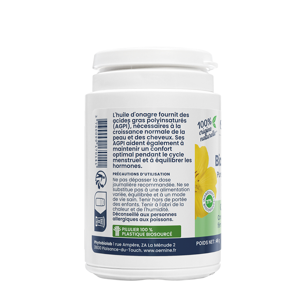 Oemine Bio-Onagre est un complément alimentaire d’origine naturelle à base d’huile d’onagre biologique garantie pure et première pression à froid. Elle est filtrée, et enrichie en vitamine E naturelle pour la protéger de l’oxydation. Puis, cette huile étant très fragile, elle est mise en capsules pour lui conserver toutes ses qualités.