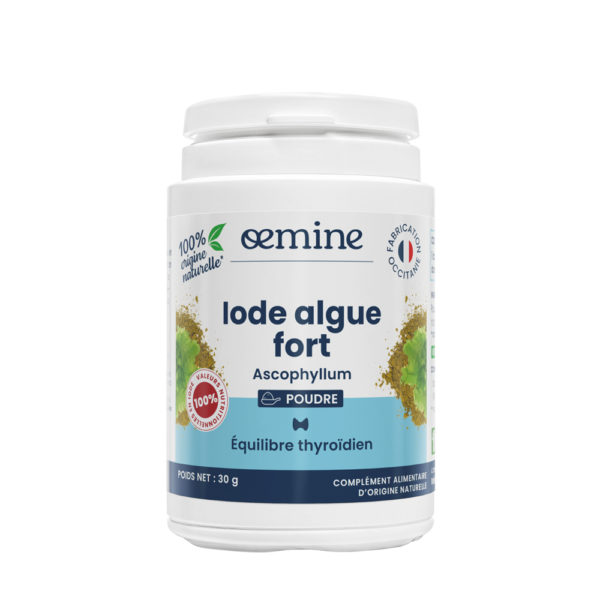 Oemine Iode Algue Fort est un complément alimentaire naturel sous forme de poudre d’algue. Il s’agit de l’Ascophyllum nodosum récoltée en mer d’Islande et particulièrement riche en iode ; ce qui permet avec une dosette (celle du flacon) de respecter un apport quotidien, aux doses recommandées en iode.