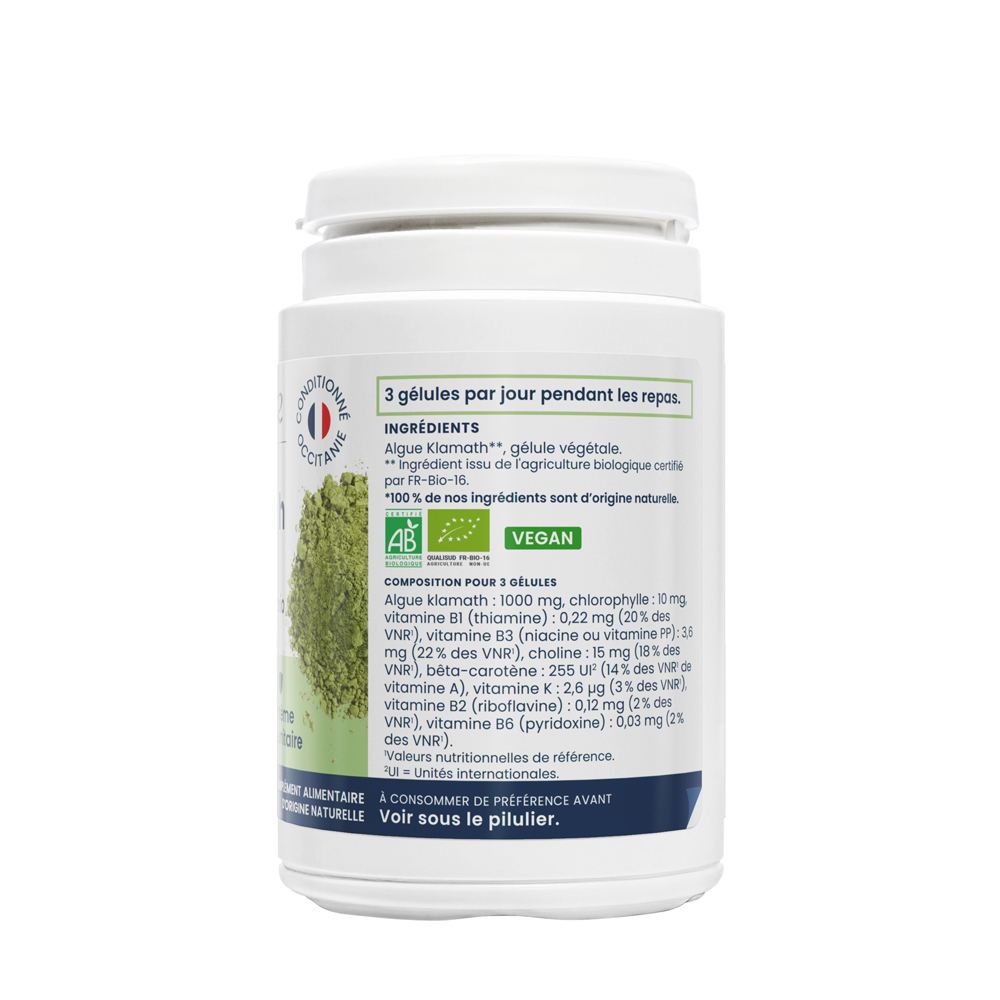 3 gélules contiennent 1000 mg d’algue klamath pure.
